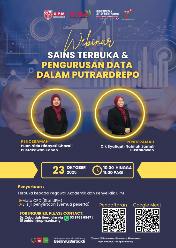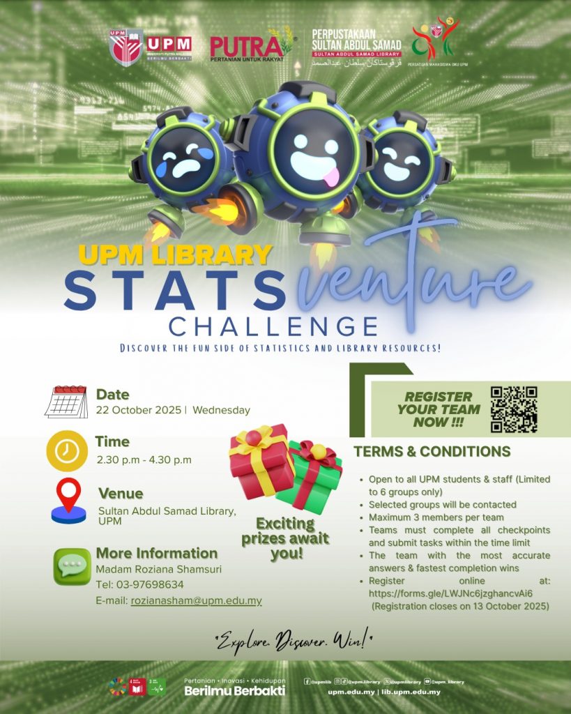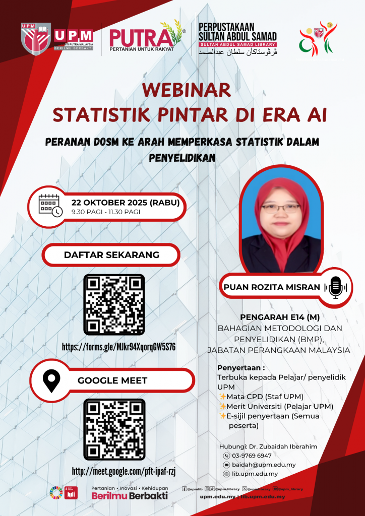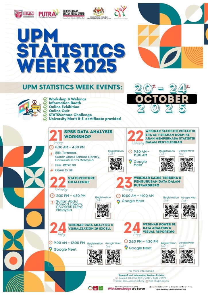 The Sultan Abdul Samad Library (PSAS), Universiti Putra Malaysia, is delighted to invite you to UPM Statistics Week 2025, themed “Nadi Statistik Kehidupan.”